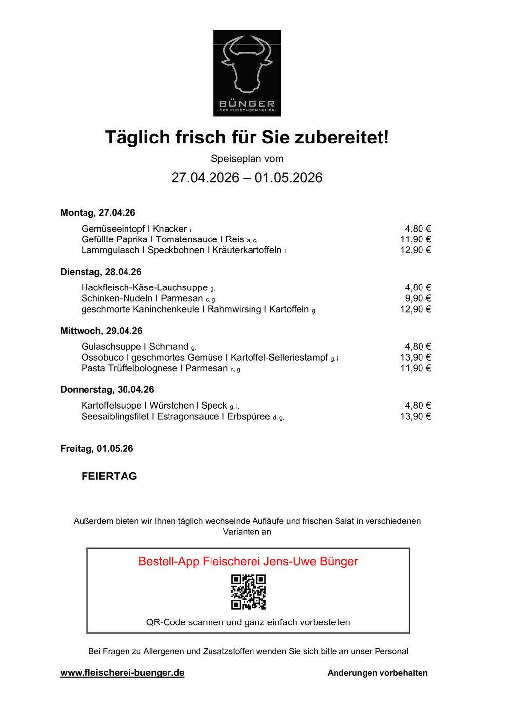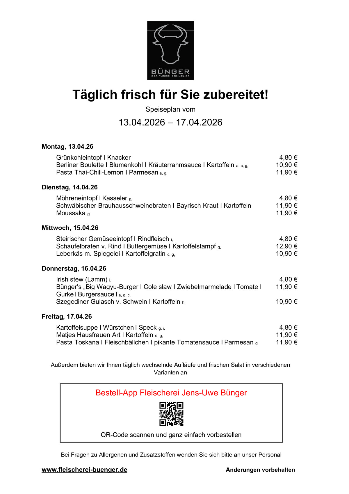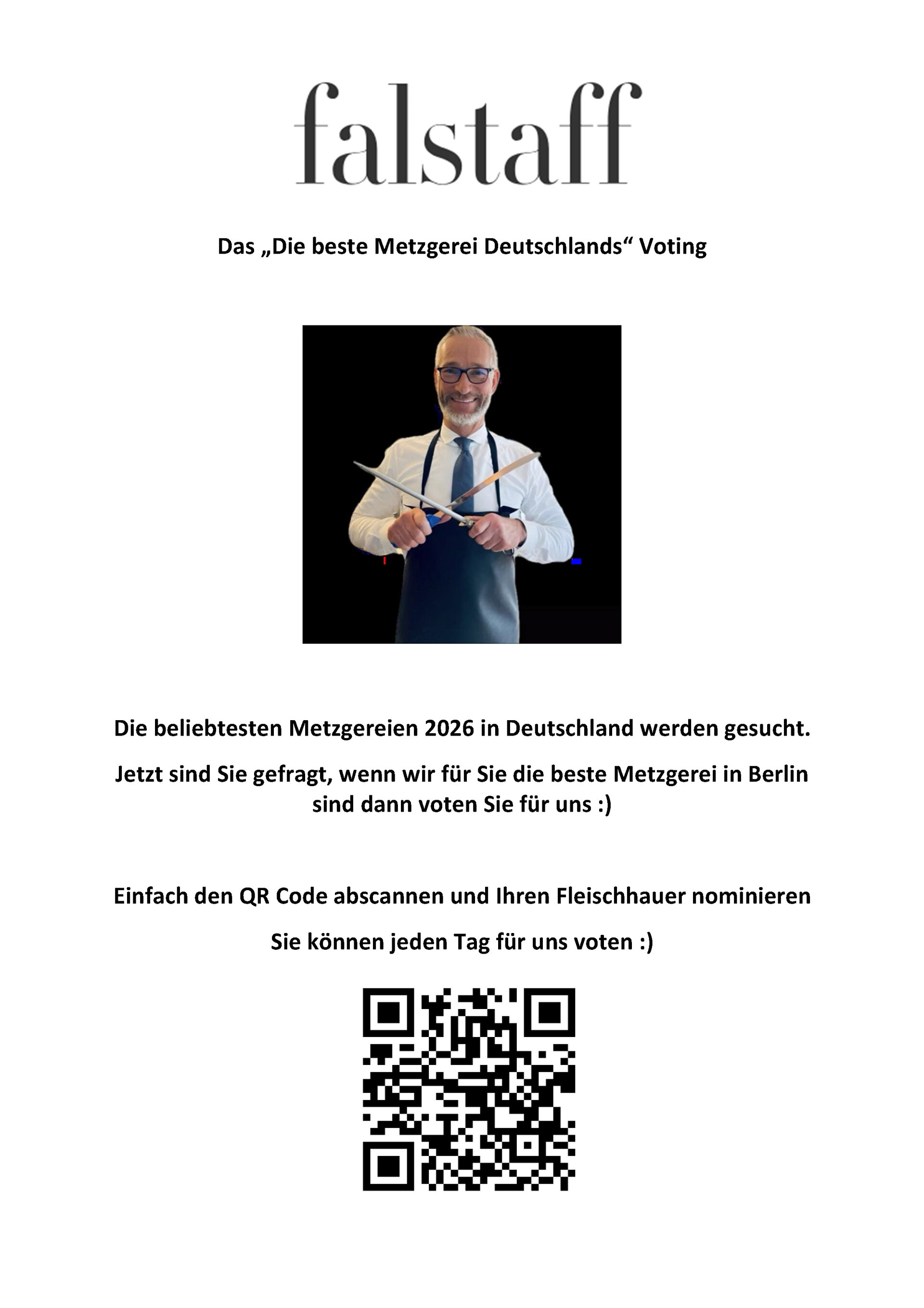 1989 tritt Jens-Uwe Bünger in die Fußstapfen seines Vaters Uwe Bünger, Obermeister der Fleischerinnung Berlin und Brandenburg von 1984 – 2000. Nach dem Abitur im Mai 1989 fängt er eine Fleischerlehre bei seinem Meister Rudolf Steck, Obermeister der Berliner Fleischerinnung von 1975-1984 in der Großbeerenstr. in Kreuzberg an. Nach einem Jahr Lehre in Kreuzberg zieht es ihn nach Bayern zur renomierten Fleischerei Kleeblatt in Holzkirchen. In Bayern erlernt er nicht nur die Techniken des Schlachtens von Schweinen und Rindern, sondern übernimmt auch viele bayrische Spezialitäten wie Weißwurst, Gelbwurst, Preßsack und vieles mehr in seine Produktion. Die Gesellenprüfung absolviert er 1991. Es folgen 4 Jahre im elterlichen Betrieb, 1994 legt er die Meisterprüfung in Berlin ab und am 02.01.1996 übernimmt er die Fleischerei in der Westfälischen Str. 53.