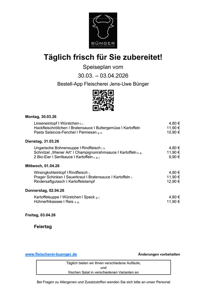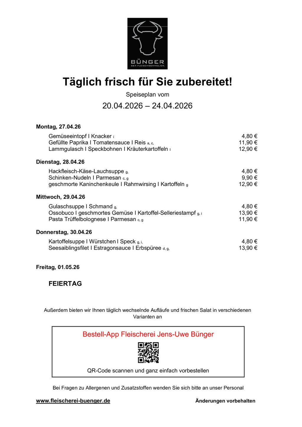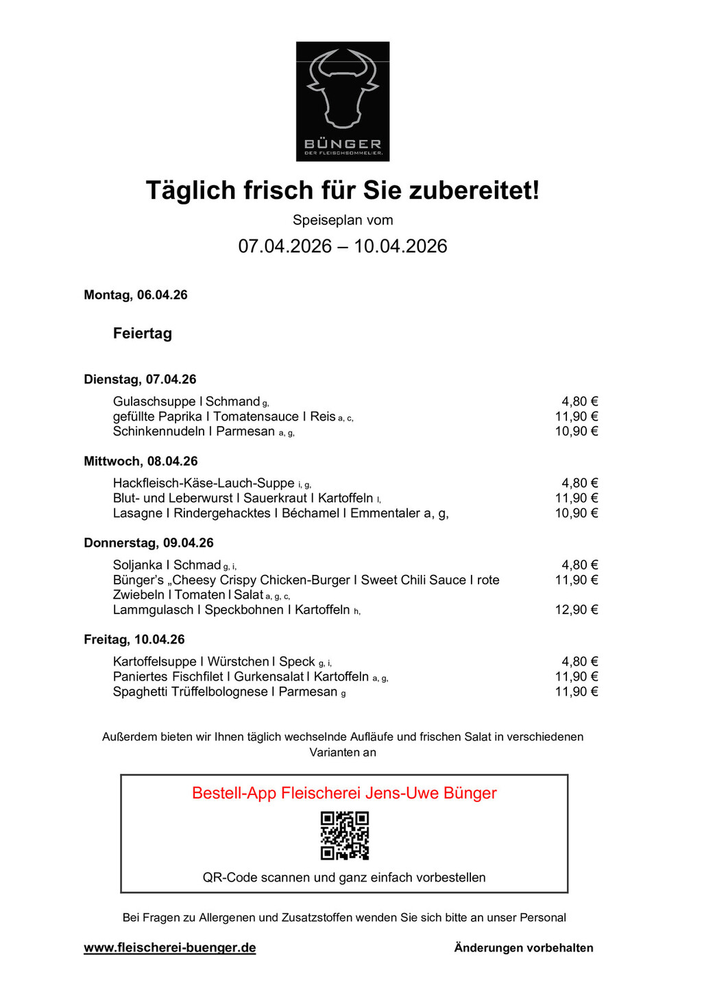 1989 tritt Jens-Uwe Bünger in die Fußstapfen seines Vaters Uwe Bünger, Obermeister der Fleischerinnung Berlin und Brandenburg von 1984 – 2000. Nach dem Abitur im Mai 1989 fängt er eine Fleischerlehre bei seinem Meister Rudolf Steck, Obermeister der Berliner Fleischerinnung von 1975-1984 in der Großbeerenstr. in Kreuzberg an. Nach einem Jahr Lehre in Kreuzberg zieht es ihn nach Bayern zur renomierten Fleischerei Kleeblatt in Holzkirchen. In Bayern erlernt er nicht nur die Techniken des Schlachtens von Schweinen und Rindern, sondern übernimmt auch viele bayrische Spezialitäten wie Weißwurst, Gelbwurst, Preßsack und vieles mehr in seine Produktion. Die Gesellenprüfung absolviert er 1991. Es folgen 4 Jahre im elterlichen Betrieb, 1994 legt er die Meisterprüfung in Berlin ab und am 02.01.1996 übernimmt er die Fleischerei in der Westfälischen Str. 53.