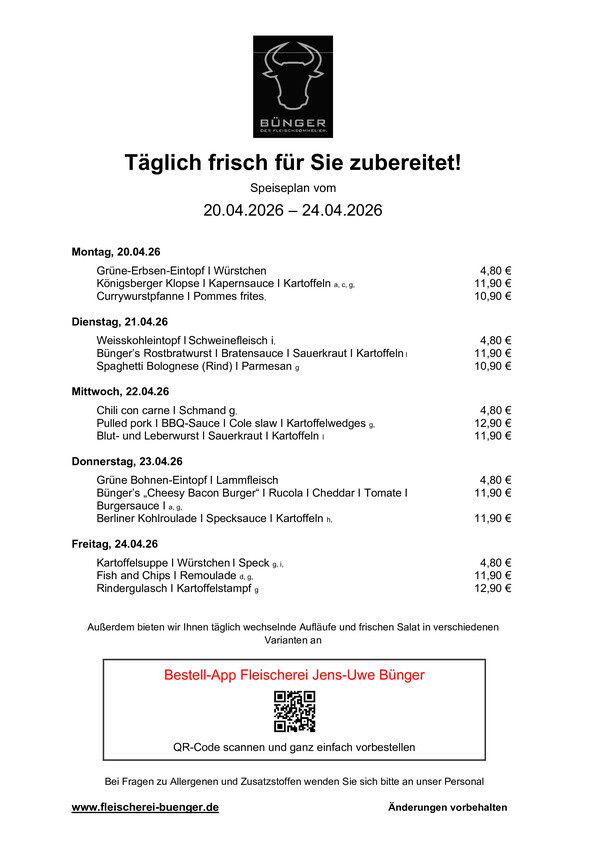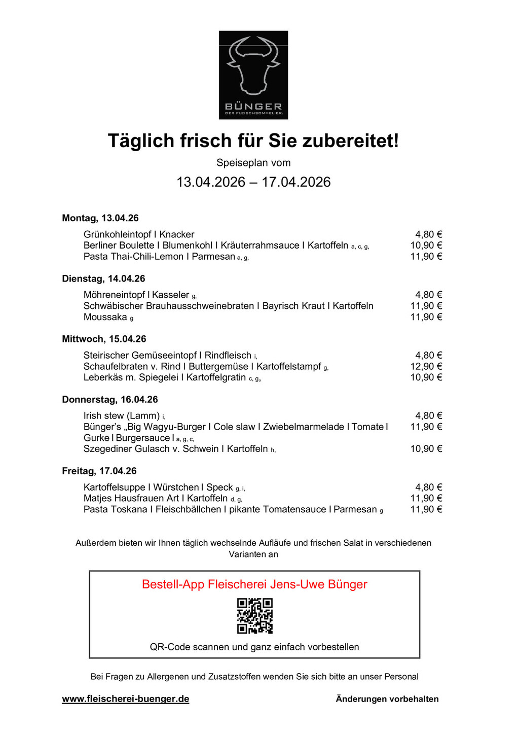 Das bunt gemischte, internationale Team um den Fleischermeister und diplomierten Fleischsommelier Jens-Uwe Bünger versorgt das verwöhnte Publikum im Westen Berlins ganzjährig und saisonal mit kreativen und hochwertigen Kreationen. Die altgedienten Mitarbeiter bewahren das wertvolle Wissen der Herstellung und vermitteln das handwerkliche Können der Fleischerzunft auch weiter. Mittlerweile hat das alteingesessene Unternehmen einige Mitarbeiter gewinnen können, welche sich die Sporen jahrelang in der Sternegastronomie verdient haben und nun als Quereinsteiger ins Fleischmetier gekommen sind. Oftmals war für die neuen Mitarbeiter ausschlaggebend, dass die Fleischerei Bünger schon seit vielen Jahren größten Wert auf die Herkunft und Aufzucht der Tiere legt.